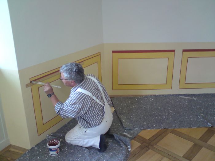 Meister Scholze bei der Neugestaltung der ehemals barocken Kassettenmalerei