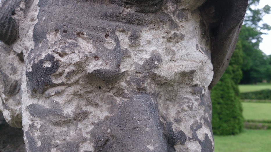 Sanierung der vier Sandsteinstatuen aus der griechischen Mythologie. Entfernen der nicht mehr tragfähigen Teile.