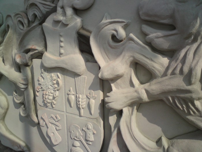 Generalsanierung des Schlossdaches 2010. Aus Gründen der politichen Ideologie der DDR wurde der Stuckgiebel nach dem 2.Weltkrieg zerstört. Nach historischem Vorbild wurden die sächsichen Löwen,umrahmt von Arkantusblättern, mit dem Familienwappen, unter erheblichem Aufwand neu gefertigt.