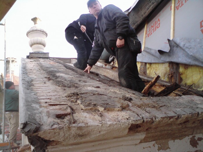 Generalsanierung des Schlossdaches 2010. Die Mauer des Schmuckgiebels über dem Portal wird ergänzt.