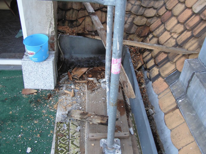 Generalsanierung des Schlossdaches 2010. Fahrlässigkeit von Handwerkern hatte das Schlossdach in Brand gesetzt. Das Feuer hatte sich bereits unter den Ziegeln nach oben augebreitet. Es konnte in letzter Sekunde gelöscht werden. Um ein erneutes Auflodern der Flammen zu verhindern, wurden noch am Abend alle alten Ziegel und das Gerüst entfernt. Anschließend durfte der Bauherr bis zum nächsten Morgen die Feuerwache halten.